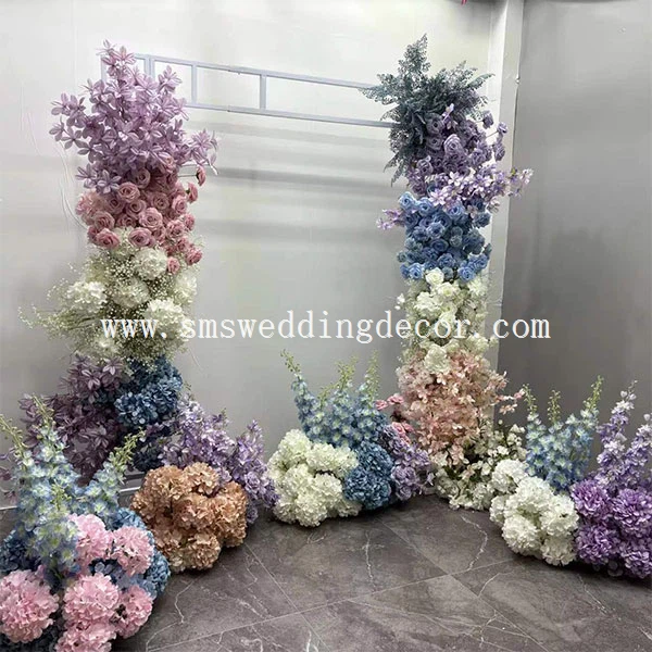 1. Tá na socruithe bláthanna uathúla seo comhdhéanta de shraitheanna bláthanna crochta agus reathaí bláthanna le haghaidh maisiú urláir. I measc na bláthanna a úsáidtear tá hydrangea, anáil an linbh, rósanna, delphiniums, etc. Tá na dathanna bán, gorm, bándearg, corcra, etc., atá galánta agus rómánsúil.